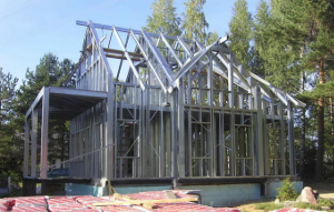 Основа строительной конструкции – тонкостенный стальной профиль. Из него может быть сделан каркас строения (который останется только утеплить и отштукатурить) или строительные панели, из которых будет состоять здание. Кроме того, из ЛСТК может быть собрана кровля дома и межэтажные перекрытия. Металлический профиль (до 3 миллиметров толщины) соединяется в единую строительную конструкцию с помощью болтов, саморезов или заклепок, иногда применяется пресс-соединение.