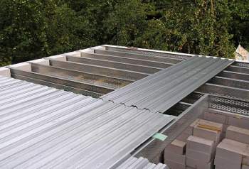 Учитывая снежную или ливневую нагрузку, как базовое основание задействуются балки из металла, дерева либо железобетона. Односкатная крыша все равно должна иметь небольшой наклон (4 - 7°) для ливнестоков, которые легче соорудить на твердой прочной поверхности типа профнастила. Он укладывается сверху балочных перекрытий. Профнастил существенно облегчает схождение воды и снежных масс, однако нужно учитывать некоторые нюансы. Чем чаще осадки в районе, тем круче угол наклона. Чем сильнее ветер, тем более пологость крышы, но с более качественной гидроизоляцией. Стыки гофролистов желательно заполнить герметиком. После устройства кровельного пирога, благодаря которому отсутствие чердачного пространства сыграет вам на руку, выполняется финишная отделка кровли. На плоских кровлях нередко устанавливают каменные либо кирпичные спецбордюры, дополнительно защищающие крышу от сильных ветров. Несущая способность ровной кровли из гофропрофиля снижает финансовые траты на железобетон или позволяет совсем обойтись без забетонирования перекрытий. Пустоты меж гофрами заполняются на всю глубину противопожарным пористым стройматериалом, для предохранения кровли от продувания. Утеплитель, подвергающийся сильным нагрузкам, должен быть прочным на сжатие. Простота конструкции плоской крыши из профнастила обуславливает ее надежность.