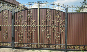 При возведении любых оградительных конструкций к главным элементам относятся ворота и калитка. Так как ворота являются подвижной частью забора и обладают большим весом, если сравнивать с одним квадратным метром ограждения, требования по качеству и надежности к ним намного выше. Чтобы сделать ворота, которые имеют небольшой вес, но при этом обладают высокой надежностью и привлекательным внешним видом, можно выполнить их из профнастила с коваными элементами.